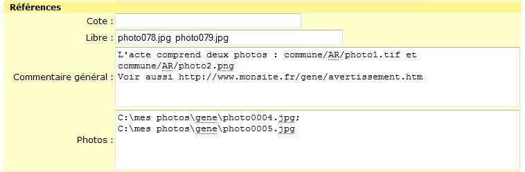 "C:\mes images\genealogie\namur\photo1234.jpg" en "http://www.site1.be/actes/namur/photo1234.jpg".Les règles sont énoncées à la suite les une des autres dans la zone URL des images d'actes [URL_JPG] :